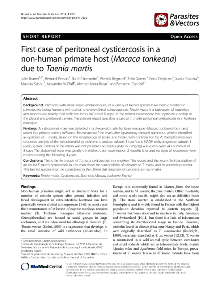 First case of peritoneal cysticercosis in a non-human primate host (Macaca tonkeana) due to Taenia martis